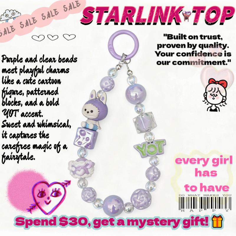 Dive into a playful dream with Lavender Pop Magic! 💜✨ This adorable phone strap sparkles with lavender beads, iridescent crystals, and a cute Labubu-style charm. Mixed with patterned purple cubes, a cheerful "YOT" bead, and fluffy cloud accents, it’s bursting with whimsical joy and personality.