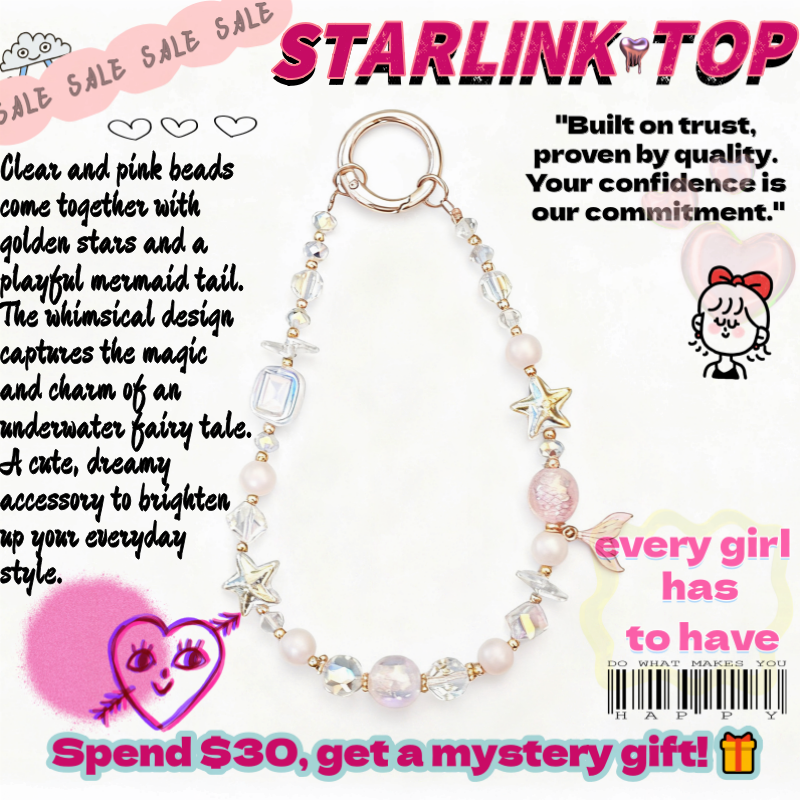 Dive into an underwater fairy tale with Mermaid Dream Gleam! 🌊🧜♀️ This enchanting phone strap combines pearlescent beads, soft pink iridescent crystals, and a delicate mermaid tail charm that sways with every move. Accented with a golden starfish and shimmering ocean-inspired details, it captures the magic of the sea in a delicate, wearable form.